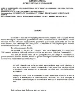 A Coligação Novos Rumos Araranguá (PRTB- PSC- DEMOCRATAS- AVANTE e PTB), através dos advogados Thiago Turelly e Marlon Carvalho, obteve liminar contra a chapa de Daniel Viriato Afonso (PP) e Anísio Premoli (PDT), em uma Ação de Investigação Judicial Eleitoral (AIJE), por postagem indevida em rede social da Prefeitura Municipal de Araranguá.