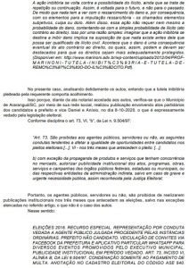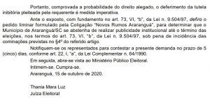 Isso porque, diante da ata notarial acostada aos autos, verifica-se que o Município de Araranguá/SC, por meio de sua rede social, realizou publicação envolvendo atos partidários dos candidatos a prefeito e vice Daniel e Anísio, no dia 8-10-2020, o que é expressamente vedado pela legislação eleitoral. […] Ante o exposto, com fundamento no art. 73, VI, “b”, da Lei n. 9.504/97, defiro o pedido liminar formulado pela Coligação “Novos Rumos Araranguá”, para determinar que o Município de Araranguá/SC se abstenha de realizar publicidade institucional até o término das eleições, nos termos do art. 73, VI, “b”, da Lei n. 9.504/97, sob pena de incidência das cominações previstas no §4º do referido artigo.
