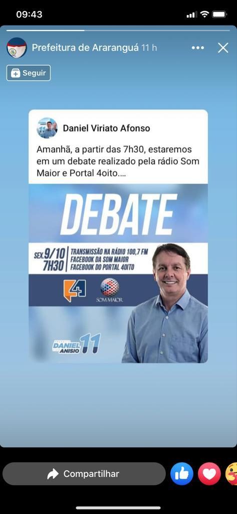 Uma falha grave. Alguém da Prefeitura postou um card da campanha de Daniel convidando para o debate organizado pela Rádio Som Maior FM, realizado dia 9 de Outubro. A Prefeitura já tem limitações legais para divulgar ações institucionais neste período, ainda mais usar o espaço público para divulgação de propaganda eleitoral.