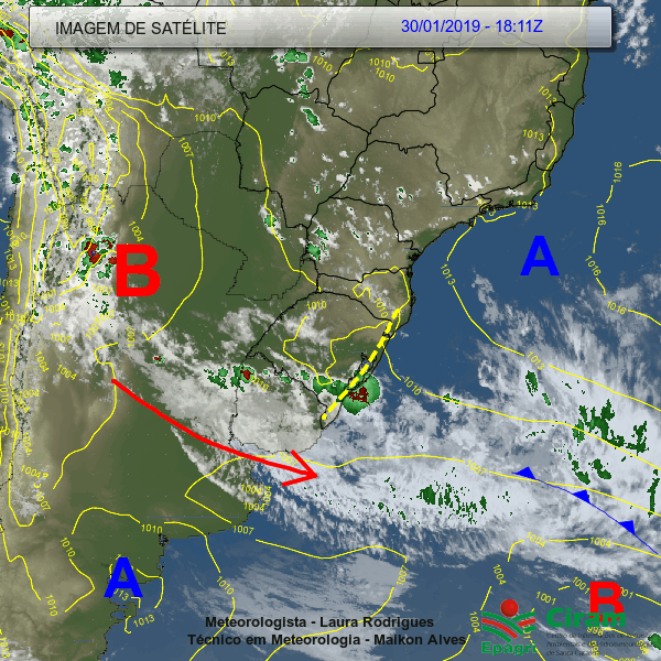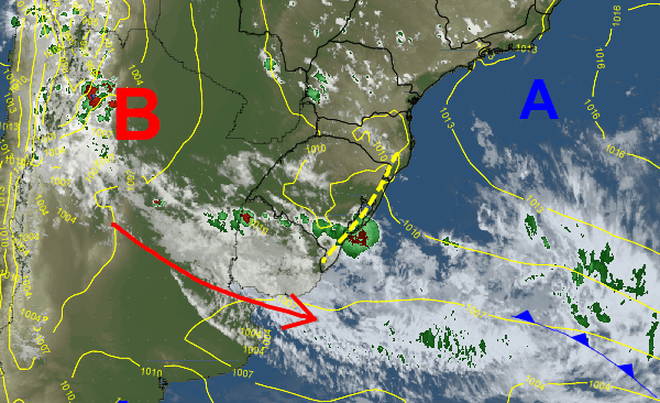 O vermelho e o azul indicam a presença de nuvens do tipo cumulunimbus, de grande desenvolvimento vertical e atividade chuvosa intensa.