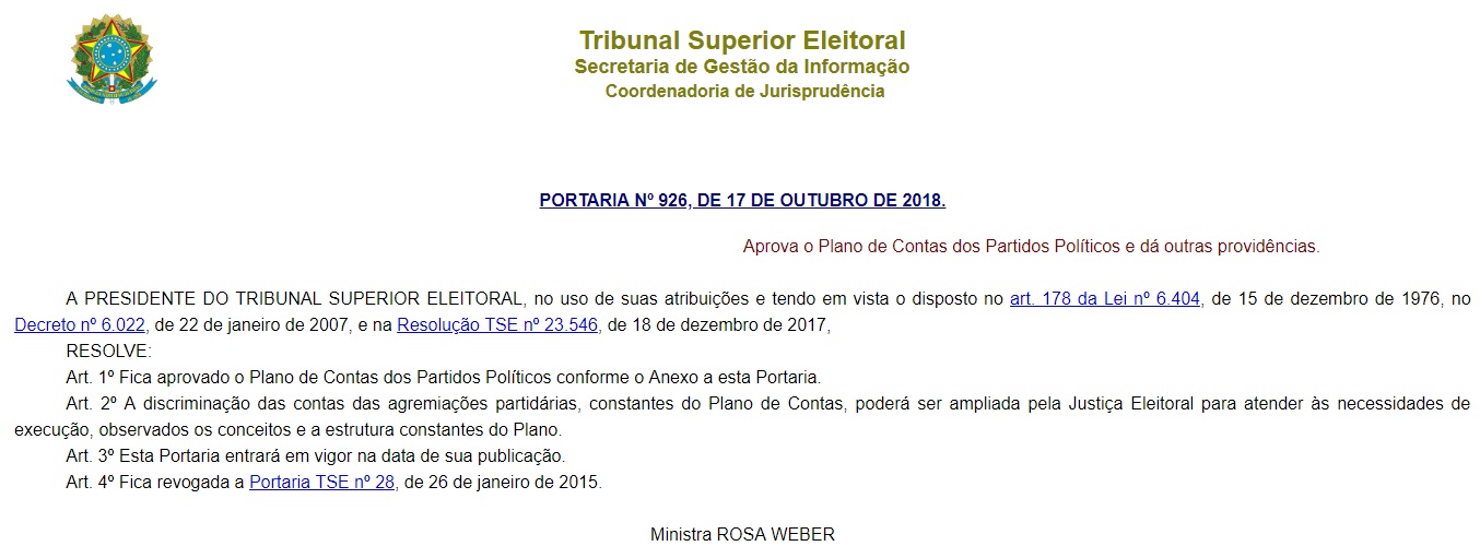 Os partidos políticos devem apresentar à Justiça Eleitoral suas contas anuais referentes ao exercício financeiro de 2018 até o dia 30 de abril de 2019. O Tribunal Superior Eleitoral aprovou um novo plano de contas, cuja utilização pelas agremiações partidárias torna-se obrigatória a partir do mês de fevereiro de 2019.