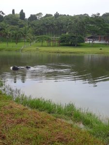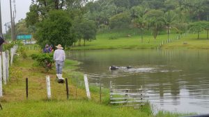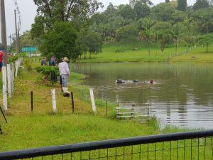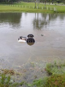 Um veículo da marca BMW, de cor branca, perdeu a direção, arrebentou o mourão de uma cerca de arame, e foi para num lago que está localizado na propriedade da família Paladini.