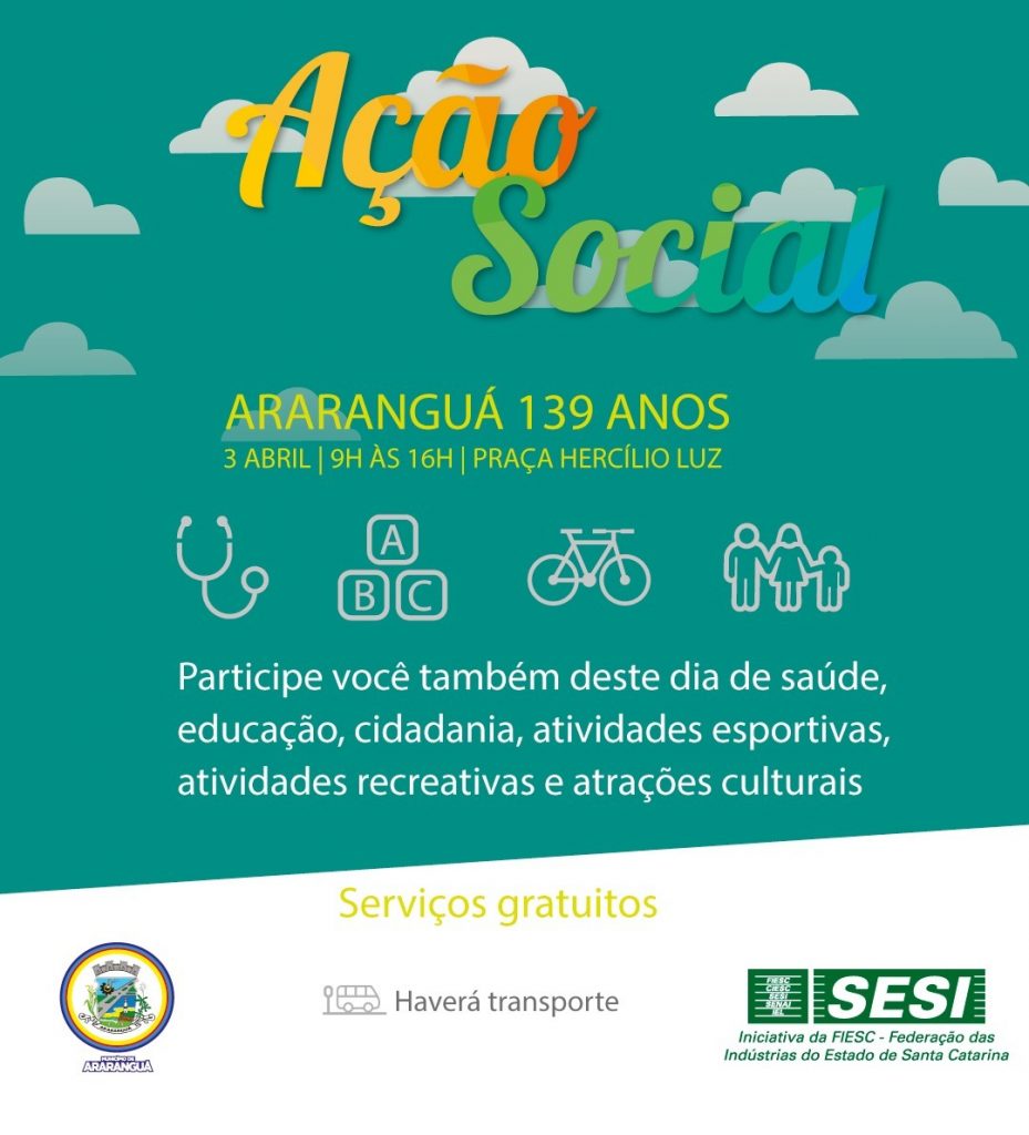 Durante todo o dia haverá transporte coletivo gratuito é o “catraca livre”. A “Ação Social Araranguá 139 Anos” é uma realização Governo do Município de Araranguá e SESI.