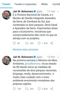 Segundo o twíte de Bolsonaro, o ministro viaja para dar “início as medidas de 1concessão dos dois parques. Emprego, renda, desenvolvimento, e muito mais cuidado com o meio ambiente envolvendo os próprios moradores das regiões”. da Serra.