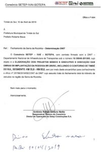 O Departamento Nacional de Infraestrutura de Transportes (DNIT/SC) determinou o fechamento total do trânsito de veículos na Serra da Rocinha, em Timbé do Sul (SC), em virtude das obras de implantação e pavimentação da BR-285/RS/SC.