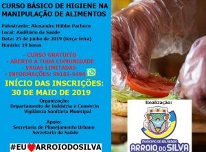 O município de Balneário Arroio do Silva realiza no próximo mês um curso básico de Higiene na Manipulação de Alimentos. O curso será gratuito e aberto para a comunidade. As vagas são limitadas e o critério de seleção será a ordem de inscrição dos participantes.