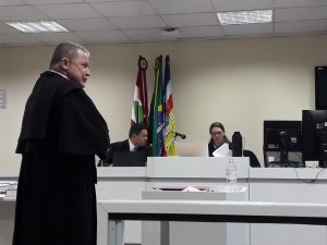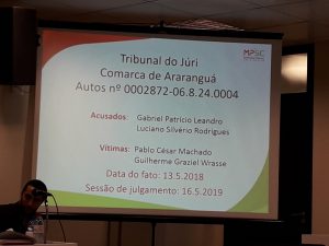 A acusação pelo Ministério Público foi feita pelo Promotor Ricardo Gabriel Zanon Meyer, que usou da palavra por quase duas horas para tentar provar que os dois acusados, que estavam presos desde junho de 2018, não só eram agressores como tinham controle sobre um grupo de menores de idade, para isto tentando aumentar a qualificadora por “corrupção de menores”.