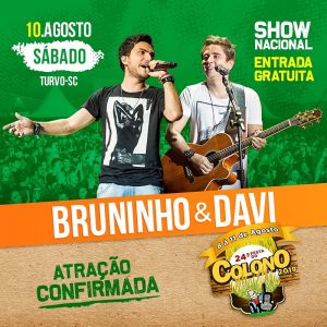 A comissão organizadora da 24° Festa do Colono de Turvo, que acontece no mês de agosto, anunciou a primeira atração musical: o show da dupla Bruninho e Davi.