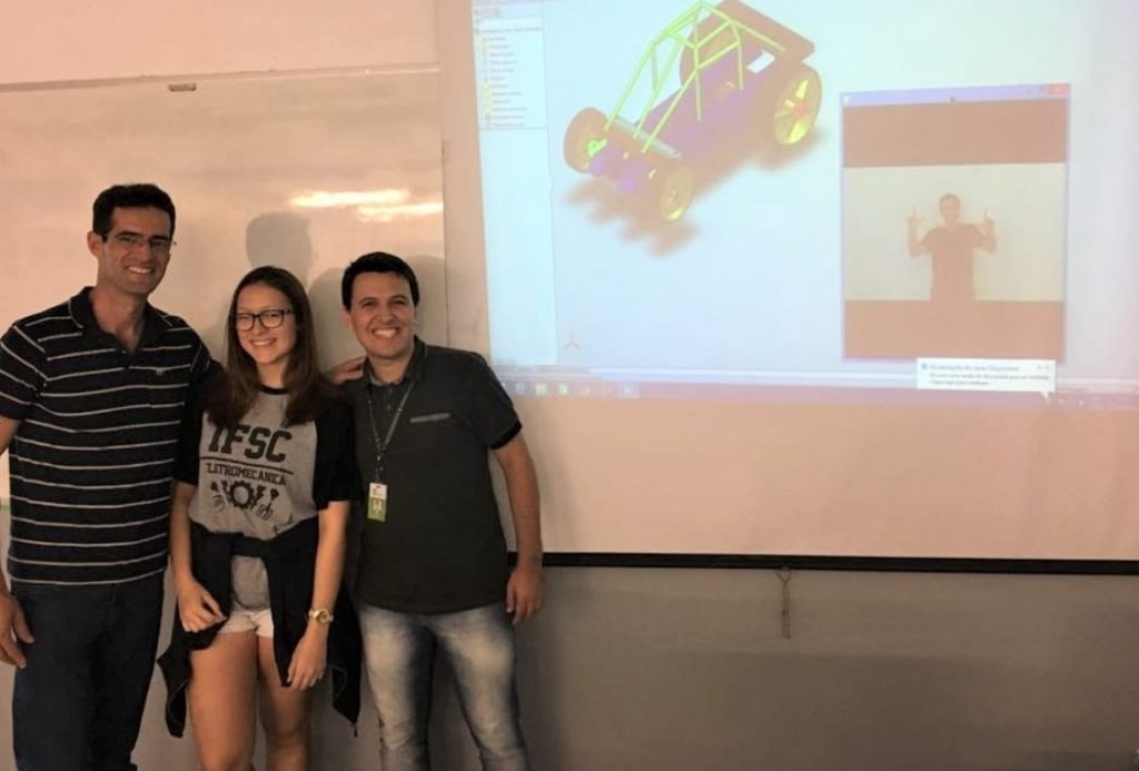 Coordenado pelo professor Fábio Evangelista Santana, do curso técnico de eletromecânica do Câmpus Araranguá, o projeto “Em busca de uma sala de aula inclusiva: introdução ao desenho técnico em Língua Brasileira de Sinais” tem a participação da bolsista Laís Duarte, estudante do curso técnico em Eletromecânica, e do intérprete de Libras do Câmpus Araranguá, Anderson Nunes. No último ano, eles trabalharam na transformação de um capítulo do livro “Meu primeiro livro de SolidWorks” em um vídeo com intérprete em Libras.