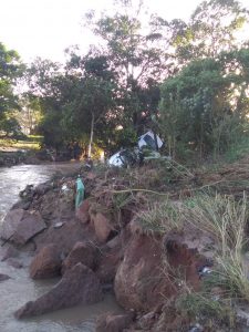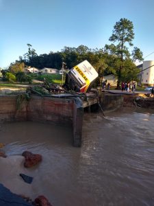 A PRF informa a interrupção do trânsito no km 356 da BR 101 em razão da cabeceira da ponte sobre o Rio Sangão ter caído.