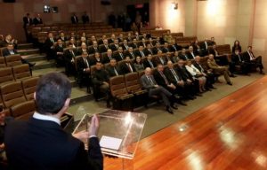 O curso de formação para os novos delegados da Polícia Civil de Santa Catarina começou na manhã desta segunda-feira, dia 3. Os 34 aprovados em concurso público que atenderam à convocação se apresentaram para a posse e foram recepcionados pelo governador Carlos Moisés na sala de cinema do Centro Integrado de Cultura (CIC), em Florianópolis. Eles irão frequentar aulas durante seis meses antes de iniciar os trabalhos. O delegado-geral de Polícia Civil, Paulo Koerich, e o presidente do Colegiado Superior de Segurança Pública e Perícia Oficial, coronel Araújo Gomes, também deram as boas-vindas aos servidores.