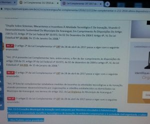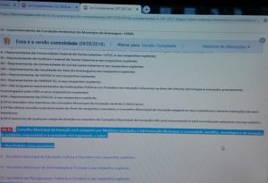 “Pela Lei Complementar nº 212, de 09 de maio de 2018, o (Poder) Executivo, sabe-se lá, até tinha o intuito de retirar a “presidência nata” do vice-prefeito. Não o fez, pode ter se atrapalhado quando do envio do projeto. Diante da continuidade da respectiva presidência ser exclusivamente do vice-prefeito; ou, por sua vacância (nos moldes do Regimento Interno da agremiação), do vice-presidente do conselho, Prof. Paulo, da UFSC; o Chefe do Executivo não contentou-se em ceder o poder e, pelo Projeto de Lei Complementar 024/018 a Câmara repassou o controle do CMI ao Prefeito Municipal, este projeto que se transformou na Lei Complementar nº 228/2018 ou 2019 [o site da Prefeitura não reporta a Lei 228, também nem a encontra, diferentemente ela está lá no site da Câmara] que embasa o Decreto nº 8.703, de 21 de janeiro de 2019 que, “DESIGNA SERVIDOR [municipal] PARA RESPONDER COMO PRESIDENTE DO CONSELHO MUNICIPAL DE INOVAÇÃO – CMI”.