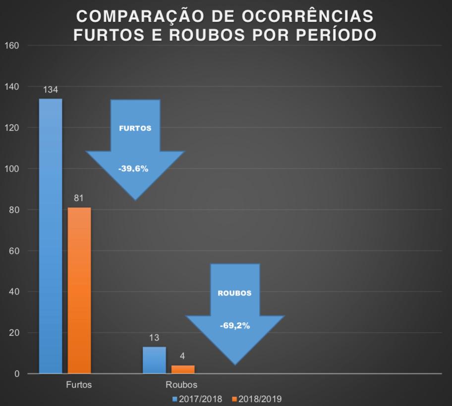 No período 2017/2018 foram 13 roubos. Já no período de 2018/2019 foram 4. Com relação a furtos a queda foi de 134 para 81 furtos.