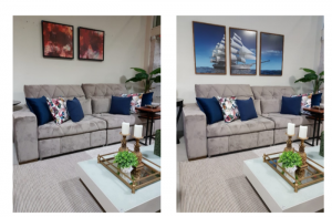 Um outro erro muito comum é o tamanho dos quadros. O tamanho dele (ou conjunto) não deve ultrapassar a largura do sofá. O erro mais tradicional é vermos quadros pequenos, por isso mostro nas imagens essa situação.