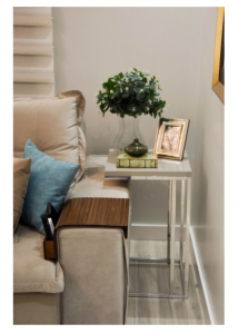 Quanto menor for um ambiente, mais cuidado devemos ter com a escolha dos móveis. O espaço deve ser funcional, ter as peças necessárias para que você tenha conforto mas não da pra fazer milagres com medidas. Existem vários macetes que podem trazer essa sensação de ambiente maior sem abrir mão de uma peça um pouquinho maior. Uma delas é usar, na sala, uma mesa lateral que transpasse o braço do sofá. Dessa forma, não precisa abrir mão da mesa lateral, ou escolher uma mesa tão pequena. Esse modelo, por ter seus pés que entram embaixo do sofá, ainda permite que seja usada pra fazer um lanche ou usar o notebook quando estivermos sentados.