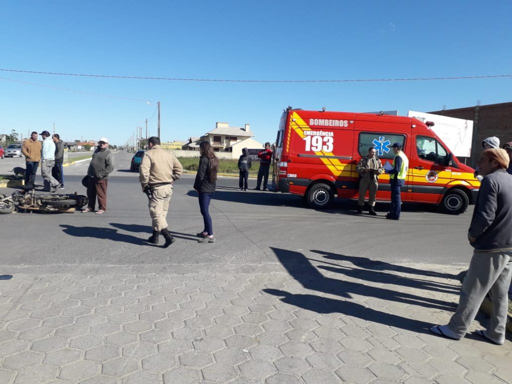 Por volta das 12 horas de hoje, dia 5, um acidente aconteceu no cruzamento entre a Avenida Florianópolis com a Avenida Cantuário dos Santos Vieira, em Balneário Arroio do Silva. O acidente envolveu uma moto e um carro.