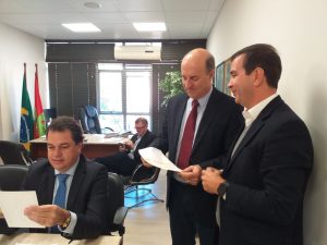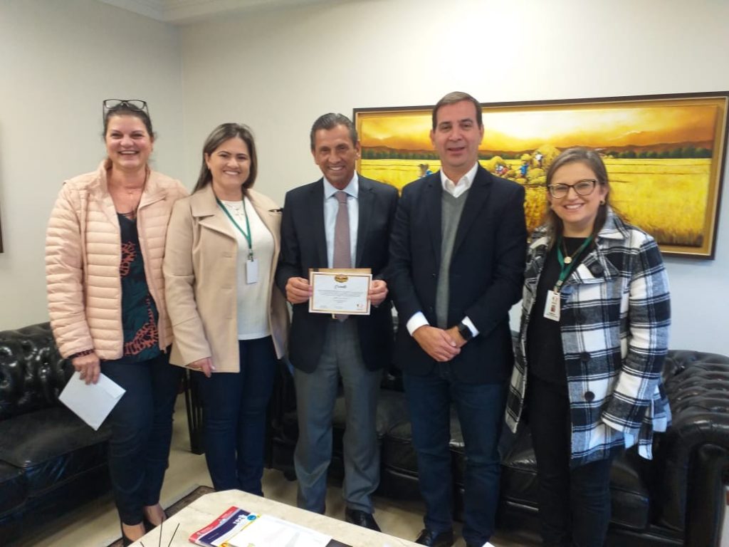 O prefeito Arlindo Rocha, que tinha reunião na Secretaria de Estado da Casa Civil, também visitou a Assembleia Legislativa, levando convites à Festa do Colono ao presidente Júlio Garcia e a deputados, em especial aos da região sul, acompanhado da secretária de Meio Ambiente e Turismo, Gisele Dal Pont e da gestora de Projetos, Odécia de Souza.
