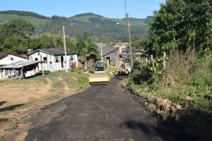 A principal rua do bairro Araçá, em Jacinto Machado, recebeu melhorias esta semana. Uma camada de asfalto frio foi colocada ao longo dos 600 metros da via, até a saída na Rodovia SC-449. O secretário de Obras, Vânio de Melo, explica que o material foi colocado ao longo da estrada