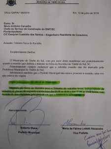O prefeito Betinho e a vice-prefeita Maria de Fátima Loetti Alexandre, a Tati (PSDB), encaminharam um ofício ao DNIT, na capital do Estado, solicitando uma audiência. O documento foi encaminhado nesta sexta-feira ao chefe do serviço de construção do DNIT/SC, Névio Antônio Carvalho, e ao engenheiro residente do consórcio, Esequiel Custódio dos Santos.