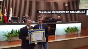 Nesta segunda-feira (5), o deputado estadual Rodrigo Minotto (PDT) foi homenageado na Câmara de Araranguá. A pedido de estudantes, o vereador Jacinto Dassoler (Progressistas) fez o reconhecimento pela atuação de Minotto junto ao governador Carlos Moisés da Silva (PSL) para liberar R$ 204 milhões para os estudantes utilizarem em bolsas de estudos dos Artigos 170 e 171.