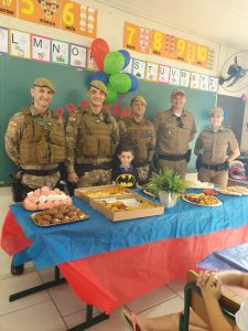 Na tarde de sexta-feira, 9, policiais militares do 19º BPM se fizeram presentes na festa de aniversário do pequeno Nicolas, que aconteceu na sala de aula, juntamente com seus coleguinhas, no bairro Operária. O menino, fã da Polícia Militar, relatou à avó que gostaria de convidar os policias para sua festa e teve seu desejo atendido. Os policiais foram recebidos com muita alegria e admiração. Após a comemoração, Nicolas e seus colegas conheceram a viatura policial militar.