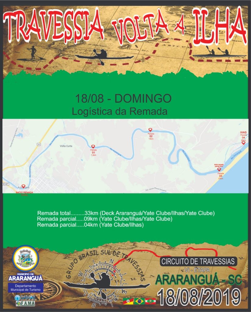 Araranguá receberá no próximo dia 18 de agosto o Grupo Brasil Sul de Travessias. Os competidores percorrerão 31 quilômetros com saída prevista para as 8h da Rua Rui Barbosa, no Espaço Remada Sul, na beira-rio, até o Balneário de Ilhas.