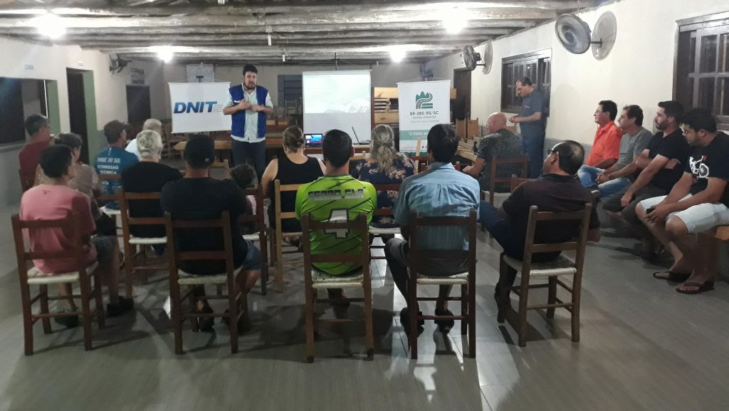 O Dnit realizou em dezembro, em Timbé do Sul, mais uma, a 9ª rodada de reuniões com as comunidades diretamente impactadas pelas obras da BR-285/RS/SC. Abordando temas referentes ao cronograma das obras, processos de desapropriação, uso e ocupação da faixa de domínio e segurança no trânsito, no encontro ainda houve espaço para apresentação do trabalho desenvolvido pela prefeitura no âmbito do Plano Diretor do município. Os encontros ocorreram na Associação de Moradores da Vila Belmiro e no Salão Paroquial da Rocinha, respectivamente.