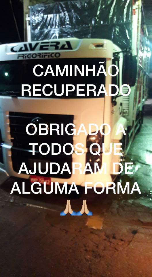 O empresário Rodrigo da Silva Turatti, do Frigorífico Caverá, informou que FOI RECUPERADO o caminhão que havia sido roubado da frota de sua empresa, de placa MMF-0042, na cidade de Canoas/RS, no Posto Buffon.