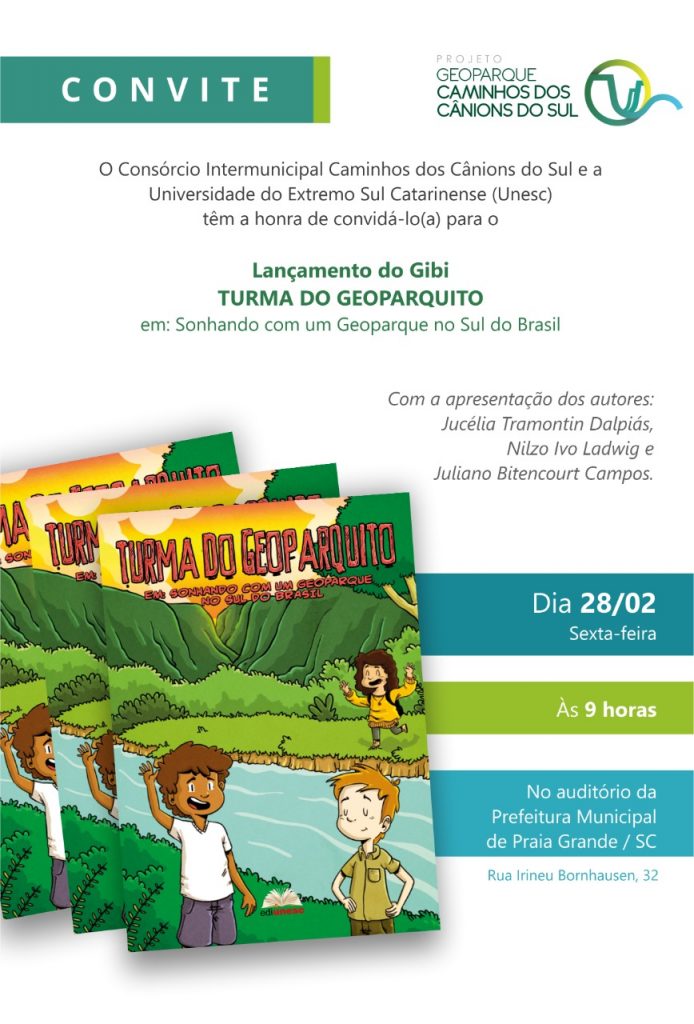 Em parceria com a Unesc, o Consórcio Intermunicipal Caminhos dos Cânions do Sul, desenvolveu o material, que se chama ‘Sonhando com um Geoparque no Sul do Brasil’, com história de Jucélia Tramontin Dalpiás, Nilzo Ivo Ladwig e Juliano Bitencourt Campos.
