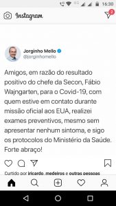 Logo após o anúncio de que o chefe da Secretaria Especial de Comunicação Social da Presidência da República, Fabio Wajngarten, testou positivo para coronavírus – COVID 19, foram canceladas as agendas do senador Jorginho Mello (PL) e deputado federal Daniel Freitas (PSL). Ambos viajaram na comitiva do presidente Bolsonaro para os Estados Unidos.