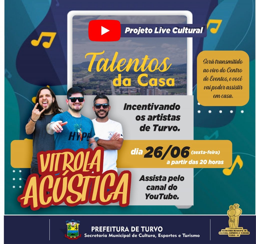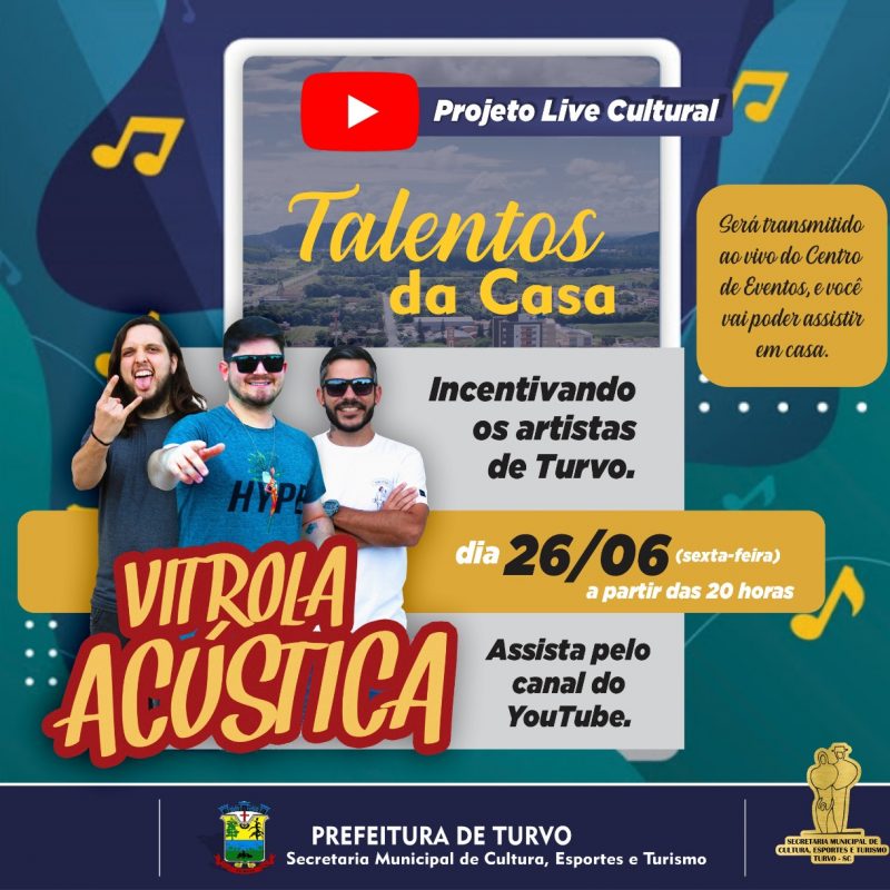 A população de Turvo e região tem aproveitado a pandemia para apreciar os talentos da cidade. O Projeto Live Cultural Talentos da Casa, promovido pela Secretaria de Cultura, Esportes e Turismo, com apoio da Administração Municipal de Turvo, tem sido um sucesso. Cinco lives já foram transmitidas até o momento, unindo o útil ao agradável: promovendo alegria, solidariedade e reconhecimento aos artistas locais.