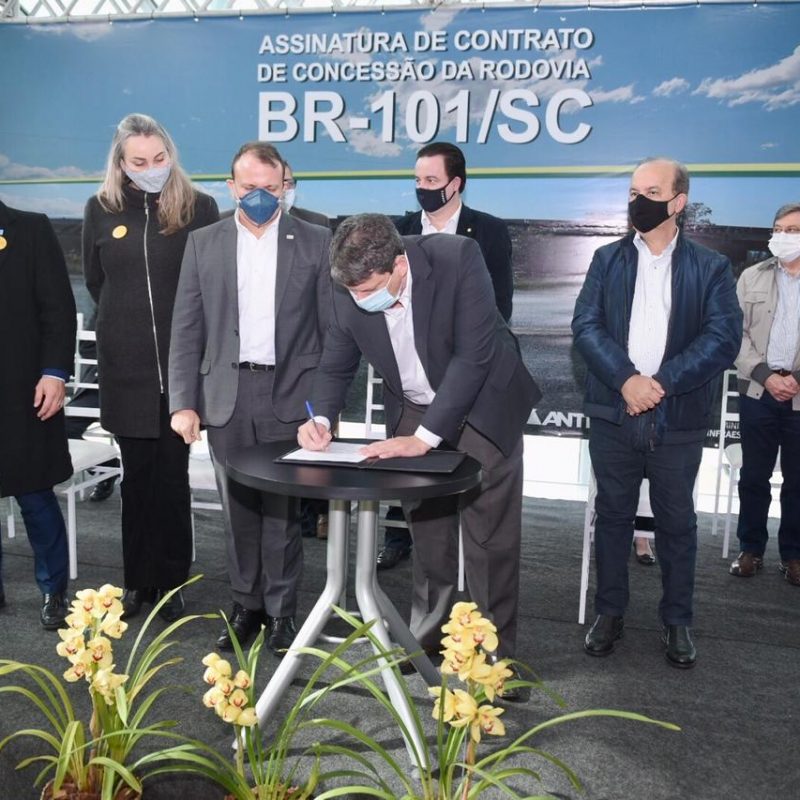 O ministro da Infraestrutura, Tarcísio Freitas, assinou na manhã desta segunda-feira (06), em Jaguaruna, o contrato de concessão da rodovia BR/101/SC (Paulo Lopes-Divisa/RS) com a operadora Concessionária Catarinense de Rodovias (CCR). O trecho concedido tem 220,4 km e contará com investimentos de R$ 7,4 bilhões.