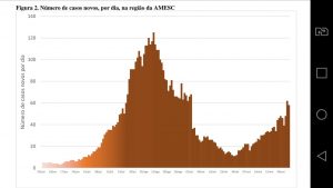 A segunda onda de Covid-19 que está atingindo Santa Catarina, também está fazendo crescer o número de novos casos confirmados na região. A média semanal subiu exponencialmente no último mês, podendo ser o indicativo do descuido da população. “As pessoas estão deixando de usar máscara, com o calor, estão realmente indo mais para a rua. Percebo que as pessoas acham que acabou o Covid, já estão cansados de ficar em casa, querem sair e os resultados a gente vê nas praias cheias, mercados cheios, festas lotadas e, muitas vezes, sem os devidos cuidados”, pontua a enfermeira da Central de Covid-19, Jadna da Rosa.