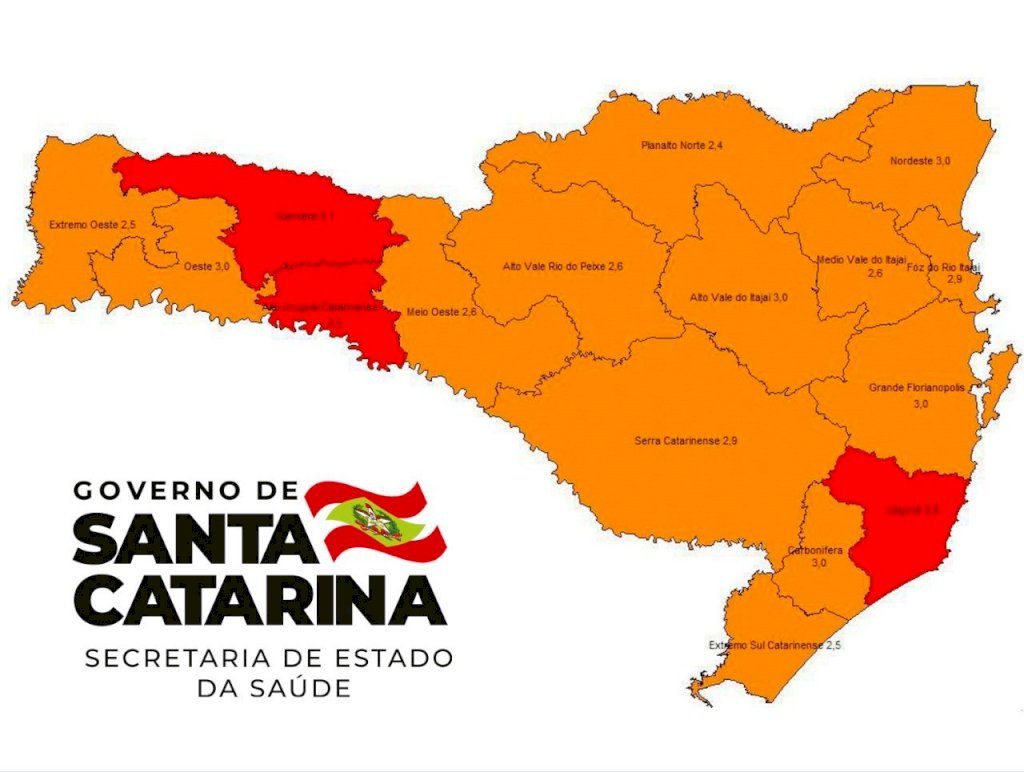 Boletim atualizado pela Secretaria de Estado de Saúde (SES) nesta quarta-feira (18) mostra que Santa Catarina está com três regiões em risco gravíssimo (vermelho) para Covid-19. São elas: Laguna, Xanxerê e Alto Uruguai Catarinense.