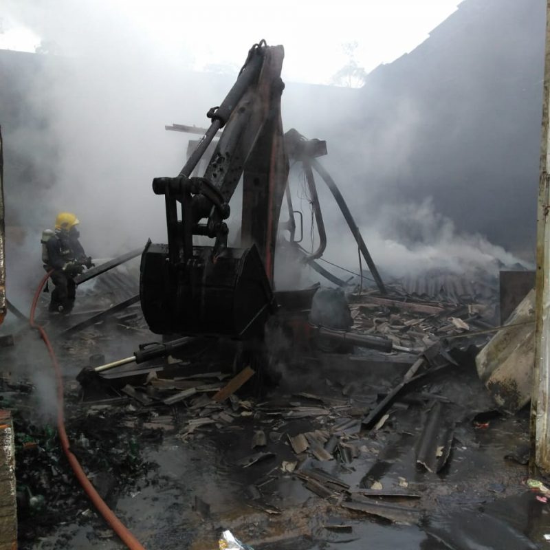 no pavilhão, que mede aproximadamente 360 m² e que estava tomado pelo fogo. Cerca de 4000 litros de água foram utilizados para extinguir as chamas. Uma retroescavadeira, que estava dentro do galpão, ficou completamente queimada.