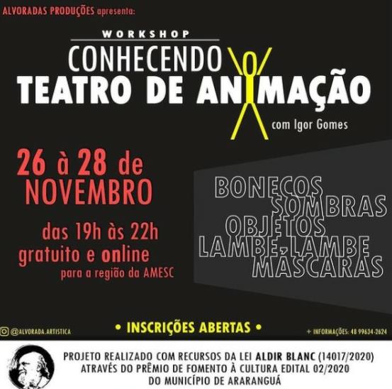 A região da Amesc recebe a partir desta quinta-feira, dia 26, um workshop gratuito sobre Teatro de Animação. O projeto chamado Conhecendo o Teatro de Animação, do ator e pesquisador Igor Gomes, é vencedor do Prêmio Aldir Blanc e uma oportunidade para professores, artistas e interessados para aprimorar sua expressão artística.