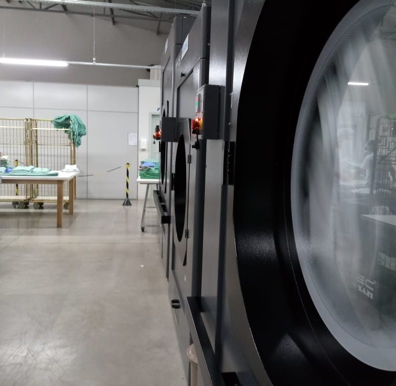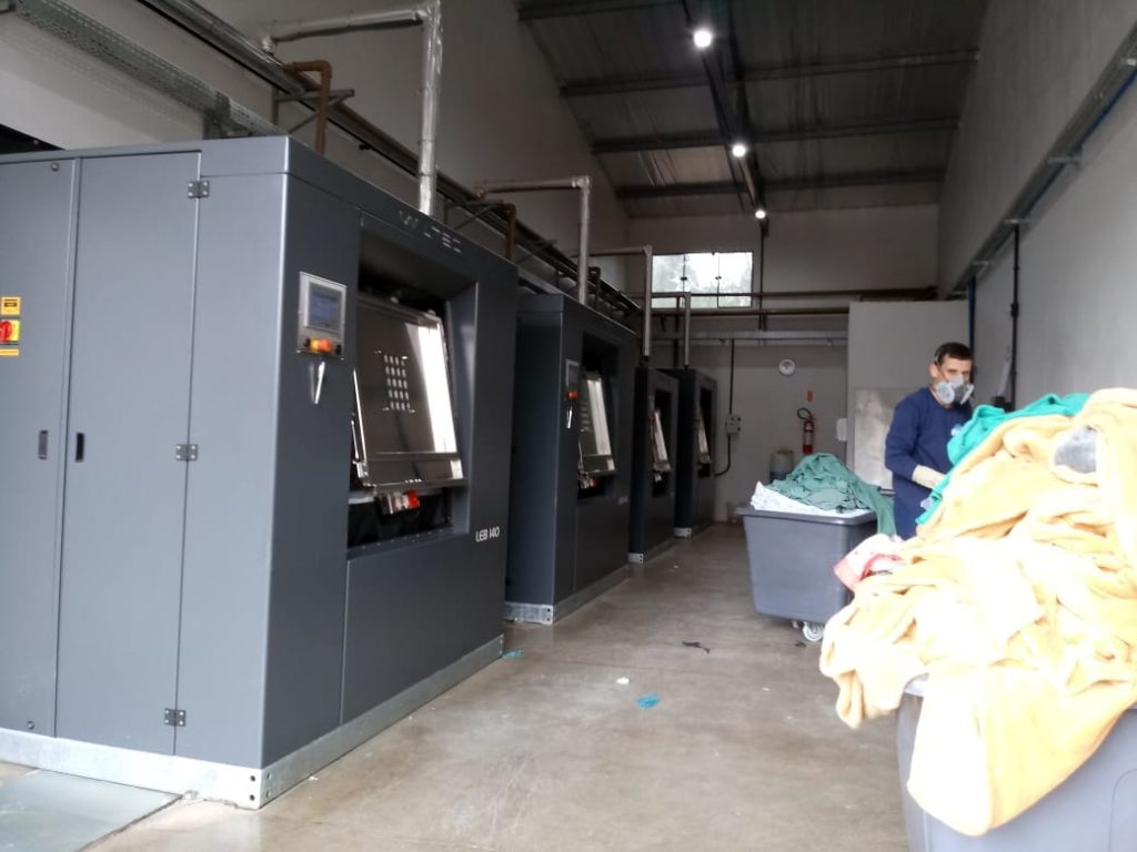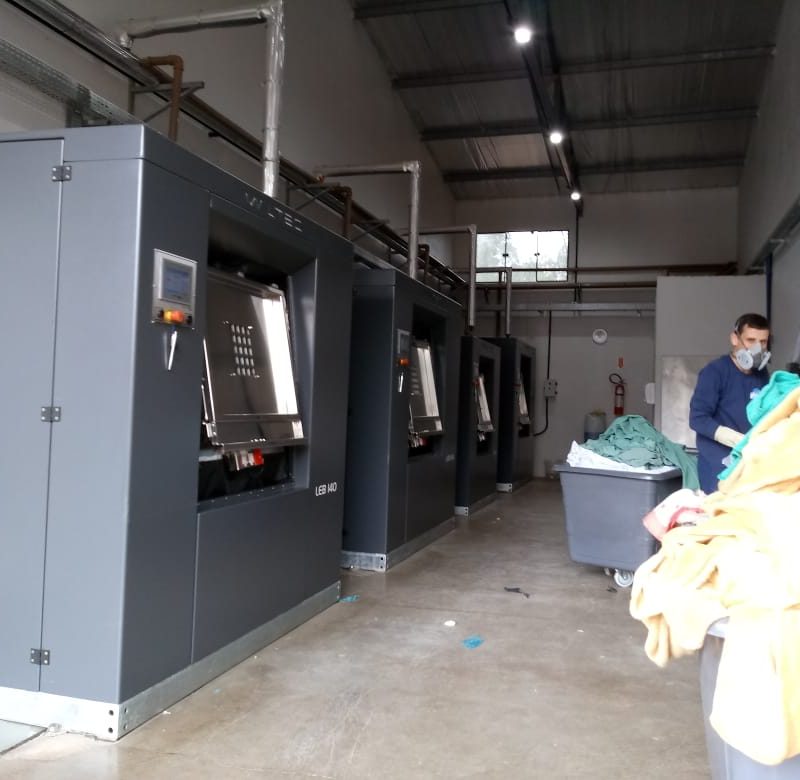 As máquinas trabalham em um sistema de barreira em que as roupas entram de um lado e saem no outro já lavadas, de modo que quem trabalha na ‘área limpa’, não tem acesso à ‘área suja’, evitando assim que haja alguma infecção. Esse sistema já existia antes da pandemia e funciona mesmo após a chegada das primeiras peças usadas no combate à doença, visto que nenhum funcionário foi diagnosticado com Covid-19 até o momento. “Já vem nas embalagens de produto infectado, então a gente já lava tudo em processo superpesado, só tira das embalagens, separa e coloca lavar”, explica.