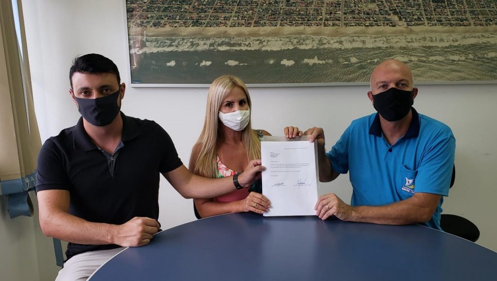 O tesoureiro geral, Dionatan Giusti, e a presidenta do PP arroiosilvense, Denisa Santos, fizeram a entrega do convênio no gabinete do prefeito Evandro Scaini (PSL).