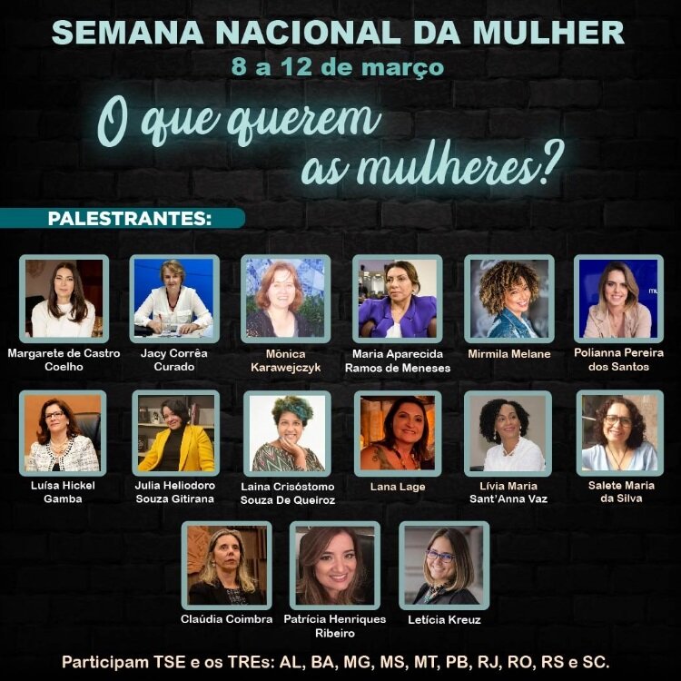 Entre os demais temas que serão debatidos durante a Semana estão: violência de gênero no ambiente de trabalho; violência política contra mulheres; a mulher e o poder político; e desafios contemporâneos da mulher no trabalho. Além do TRE-SC, fazem parte da organização do evento o TSE os TREs de Alagoas, Bahia, Minas Gerais, Mato Grosso do Sul, Mato Grosso, Paraíba, Rio de Janeiro, Roraima e Rio Grande do Sul.