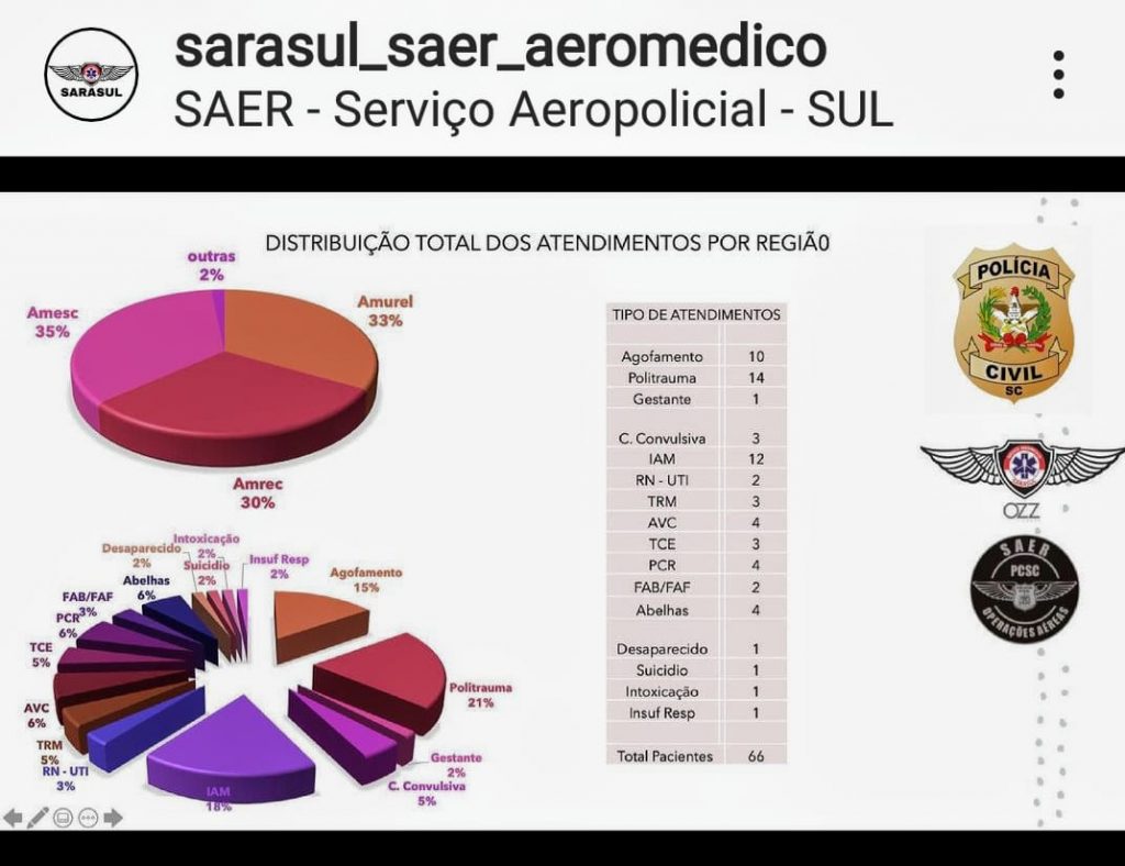 A pequena diferença entre a porcentagem das ações do Saer/Sarasul em cada região também surpreendeu a equipe. De acordo com o relatório, 35% dos atendimentos ocorreram na Amesc, enquanto outros 33% ocorreram na Amurel e 30% na Amrec. “Já tínhamos uma noção de que o serviço faria mais atendimentos tanto na Amesc quanto na Amurel, do que da Amrec, mesmo porque o tempo-resposta é o fundamental da aeronave, e como essas cidades ficam mais distantes do hospital de referência, que é o São José de Criciúma ou o Nossa Senhora de Fátima em Tubarão, imaginamos que atuaríamos mais nessas cidades”, completa.