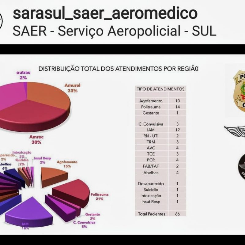 Em pouco mais de três meses de funcionamento, o Serviço Aeropolicial e Aeromédico (Saer/Sarasul), já fez mais de 66 atendimentos em toda a região Sul do estado. O número está em um relatório apresentado pelo serviço na última semana e que contabilizou os trabalhos realizados pelo serviço entre 21 de dezembro de 2020, data em que o Saer/Sarasul passou a operar, e o último dia 5 de abril. Ainda segundo o levantamento, neste período o maior número de atendimentos foi de vítimas de afogamento(10), politraumas(14) e Infarto Agudo do Miocárdio(12). “O início do serviço coincidiu com a temporada de veraneio em momento de pico, e como o litoral é bem extenso, a gente já esperava o número de afogamentos. Na questão dos IAM, se você realiza um procedimento chamado trombólise em até duas horas do início do infarto, você tem uma taxa de recuperação de até 100% do paciente, ele fica praticamente sem sequelas. Por isso a necessidade da rapidez da aeronave”, explica Gilberto Crepaldi Mondini, delegado de polícia e piloto de helicóptero, que atua no Saer. A mesma lógica se aplica na questão dos Acidentes Vasculares Cerebrais, AVCs.