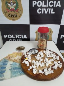 A Polícia Civil de Turvo e Jacinto Machado, coordenados pelo Delegado Lucas Fernandes da Rosa, efetuaram na tarde desta segunda feira, 19, a prisão em flagrante de um homem de 36 anos de idade, por tráfico de drogas, no Bairro Araça em Jacinto Machado.