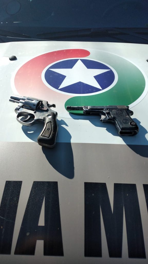 Ao avistar a chegada das guarnições, o suspeito correu para trás de sua residência e jogou duas armas de fogo em um matagal atrás da casa. Foram encontrados um revólver Calibre .32, uma pistola Calibre .25 e um carregador com 3 munições.