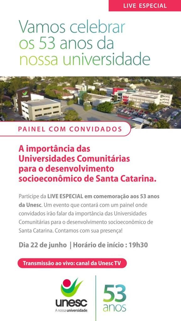 Ao completar 53 anos nesta terça-feira (22/6), a Unesc comemora uma história marcada pelo protagonismo de uma universidade comunitária ativa e presente no Sul do estado. Para celebrar a data, a instituição convida a comunidade para um painel virtual com o tema: A importância das Universidades Comunitárias para o Desenvolvimento Socioeconômico de Santa Catarina. O evento acontecerá a partir das 19h30, no canal da Unesc Tv no YouTube.
