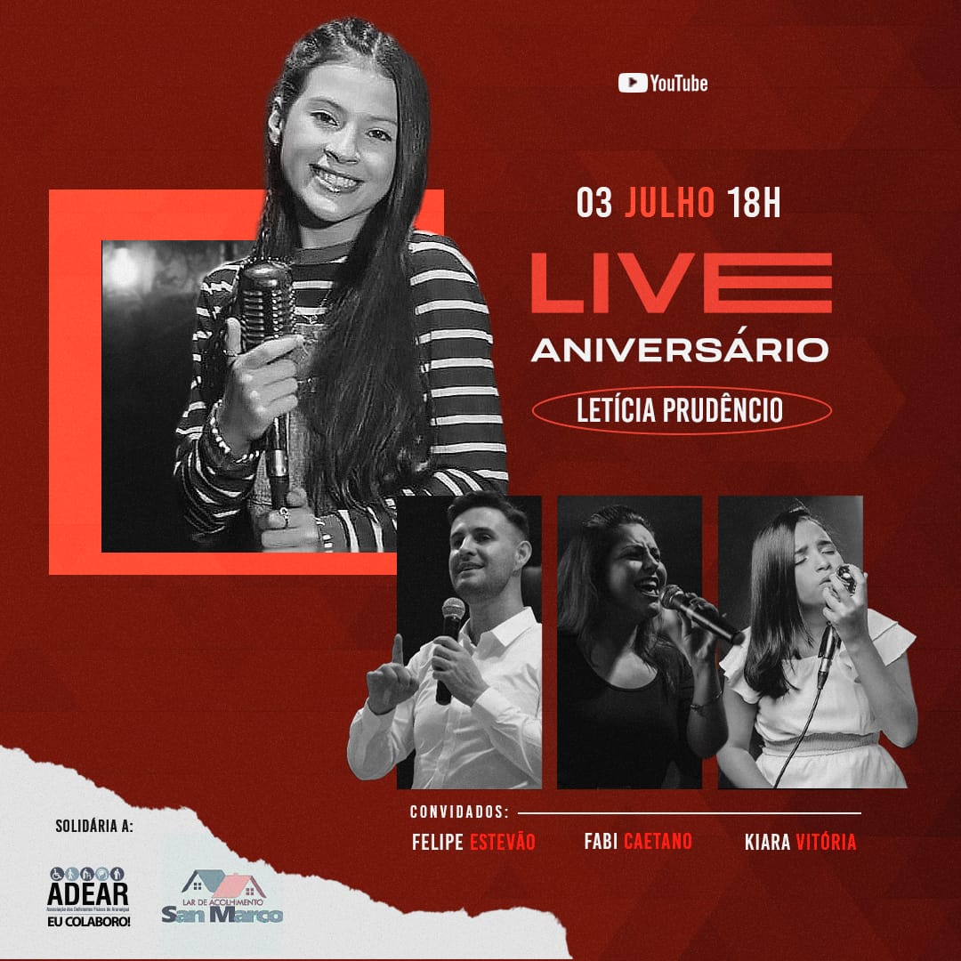 Acontecerá no próximo dia 3 de julho, sábado, a segunda Live de Aniversário da cantora Letícia Prudêncio. A cantora ganhou notoriedade depois de participar do Programa The Voice Kids, da Rede Globo, e hoje representa Araranguá como integrante de uma das maiores gravadoras da música gospel do país, a Todah Music.