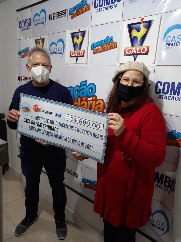 O representante comercial da Muller e Selmi, que apoiaram a campanha com a marca Galo no mês de junho, Cleber Giovane da Silva, esteve na Casa da Fraternidade para fazer a entrega do cheque simbólico. Para ele, foi uma alegria poder fazer parte mais uma vez da campanha. “Nossa referência é o seu Zefiro Giassi, empresário da rede Giassi e Combo, grande mobilizador deste projeto social, que tem se empenhado a vida toda em prol dos seus semelhantes”, disse.