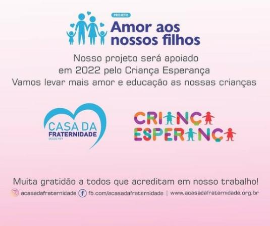 A Casa da Fraternidade de Araranguá teve um de seus projetos contemplados pelo Edital Criança Esperança para 2022. De acordo com a direção da casa, a ação selecionada foi o Projeto Amor aos Nossos Filhos, que com um incentivo a mais do Criança Esperança, poderá “levar muito mais amor e educação para nossas crianças”. Nas redes sociais, a equipe da casa agradeceu ao apoio da comunidade em geral. “Estamos muito felizes!! Temos muito a agradecer a todos vocês que confiam em nosso trabalho”, escreveu.