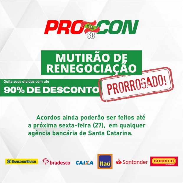 O PROCON/SC, órgão integrante da Secretaria de Estado do Desenvolvimento Econômico Sustentável, prorrogou até a próxima sexta-feira, 27, o mutirão para renegociação de dívidas dos consumidores, que devem procurar as agências das instituições bancárias do estado parceiras do evento, . Participam da ação o Banco do Brasil, Santander, Bradesco, Itaú, Koerich e a Caixa Econômica Federal, que está dando até 90% de desconto para quem tiver interesse em quitar seus débitos.