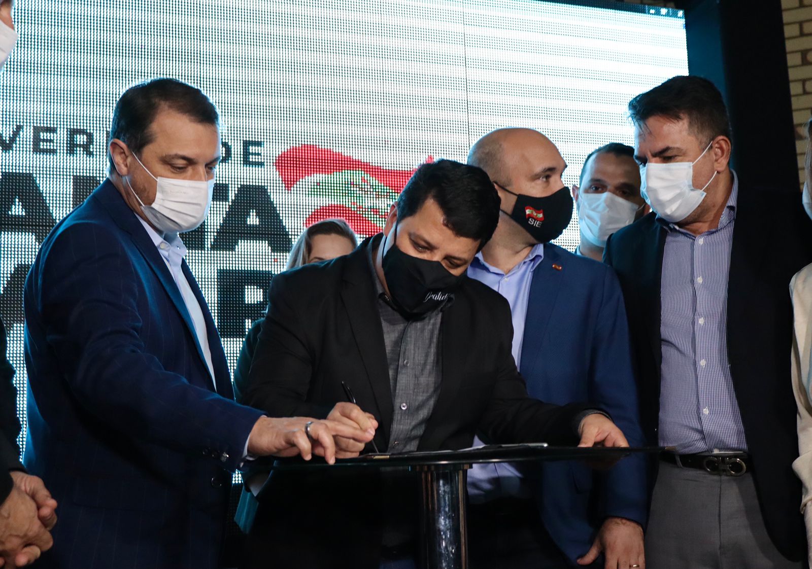 O secretário da Saúde André Motta Ribeiro faz o repasse de valores referente à Portaria de habilitação de leitos de UTI/Covid para o Hospital Regional de Araranguá.