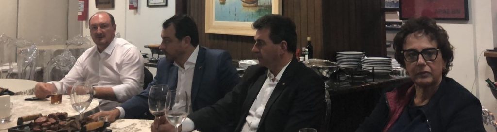 Comitiva municipal, formada pelo prefeito Evandro Scaini (sem partido), presidente da Câmara de Vereadores Vanderlei de Souza (PSL) e vereadores Elvio Zocche (PSL) e Pedro Coelho (PSL), cumpre roteiro em Brasília. Ao deputado Ricardo Guidi (PSD) agradeceram emenda liberada para a construção do Centro Multiuso e emenda para a pavimentação de trecho da rua Farroupilha. O vereador Pedrinho fez pedido de emenda para melhoria de rua na Praia da Meta.